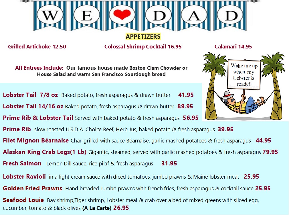Here's a brief description and Customer reviews of Rudy's Hideaway Sea Food Restaurant for your information. https://www.opentable.com/rudys-hideaway Home Food Delivery is also available via Door Dash. The regular menu is not as pricey as the Father's Day menu above.